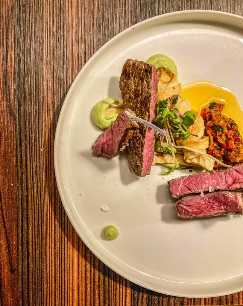 Wagyu Japonsko A5 – hovězí picanha, wasabi majonéza, enoki, ředkev