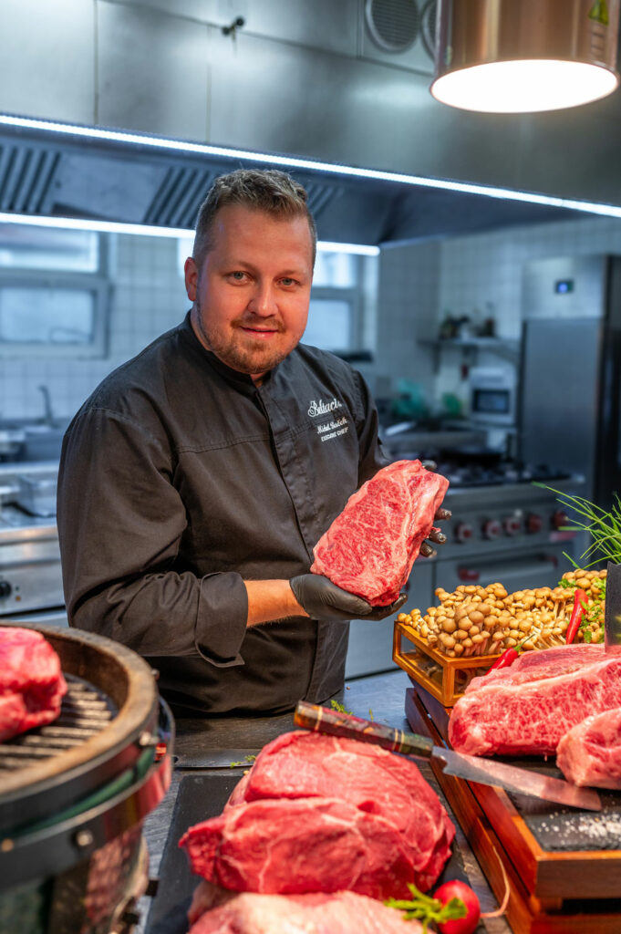 Mimořádně jemné maso s typickou mramorovaností a sametovou texturou. Lehce pikantní wasabi majonéza a svěží ředkev vyvažují jeho intenzitu, zatímco houby enoki přinášejí elegantní umami tón.